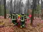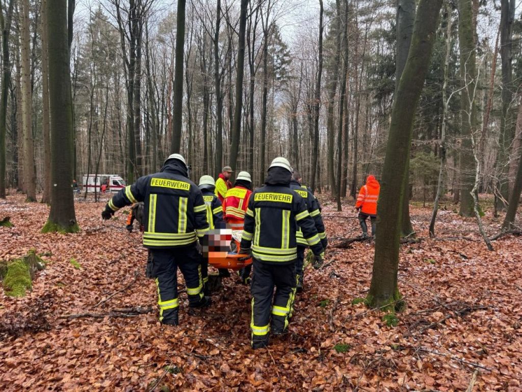 Ein Treiber war im unwegsamen Gelände gestürzt und hatte sich dabei vermutlich eine Fraktur zugezogen. Nach der medizinischen Erstversorgung durch die Besatzung des Rettungswagens musste der Patient rund 600 Meter über unwegsames Waldgelände zum bereitstehenden Rettungswagen transportiert werden.